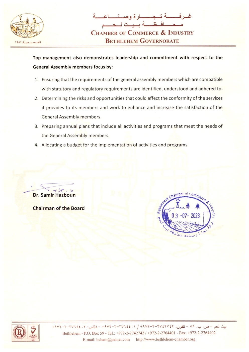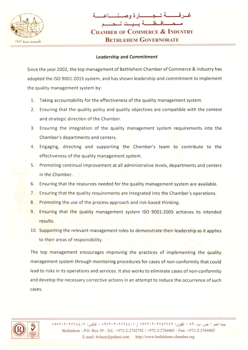 Leadership and commitment in Bethlehem Chamber of Commerce & Industry in accordance with the international standard ISO 9001: 2015