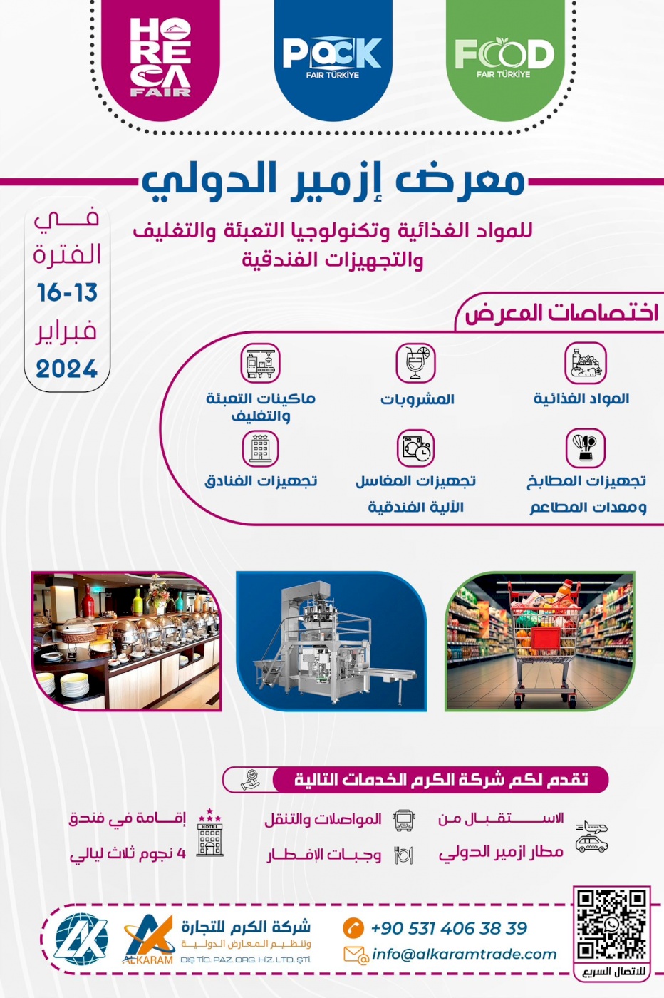 تهديكم غرفة تجارة وصناعة محافظة بيت لحم أطيب التحيات، ونرفق لحضرتكم ما ورد الينا من شركة الكرم للتجارة وتنظيم المعارض الدولية بخصوص المشاركة في معرض أزمير الدولي للمواد الغذائية وتكنولوجيا التعبئة والتغليف والتجهيزات الفندقية والمنعقد خلال الفترة الواقعة ما بين 13 لغاية 16 شباط لعام 2024.