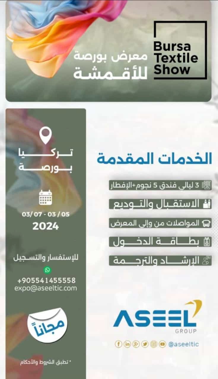 تهديكم غرفة تجارة وصناعة محافظة بيت لحم أطيب التحيات، ونرفق لحضرتكم ما ورد الينا من مجموعة أسيل التجارية بخصوص المشاركة في معرض بورصة للأقمشة والمنعقد خلال الفترة الواقعة ما بين 05 لغاية 07 اذار لعام 2024.