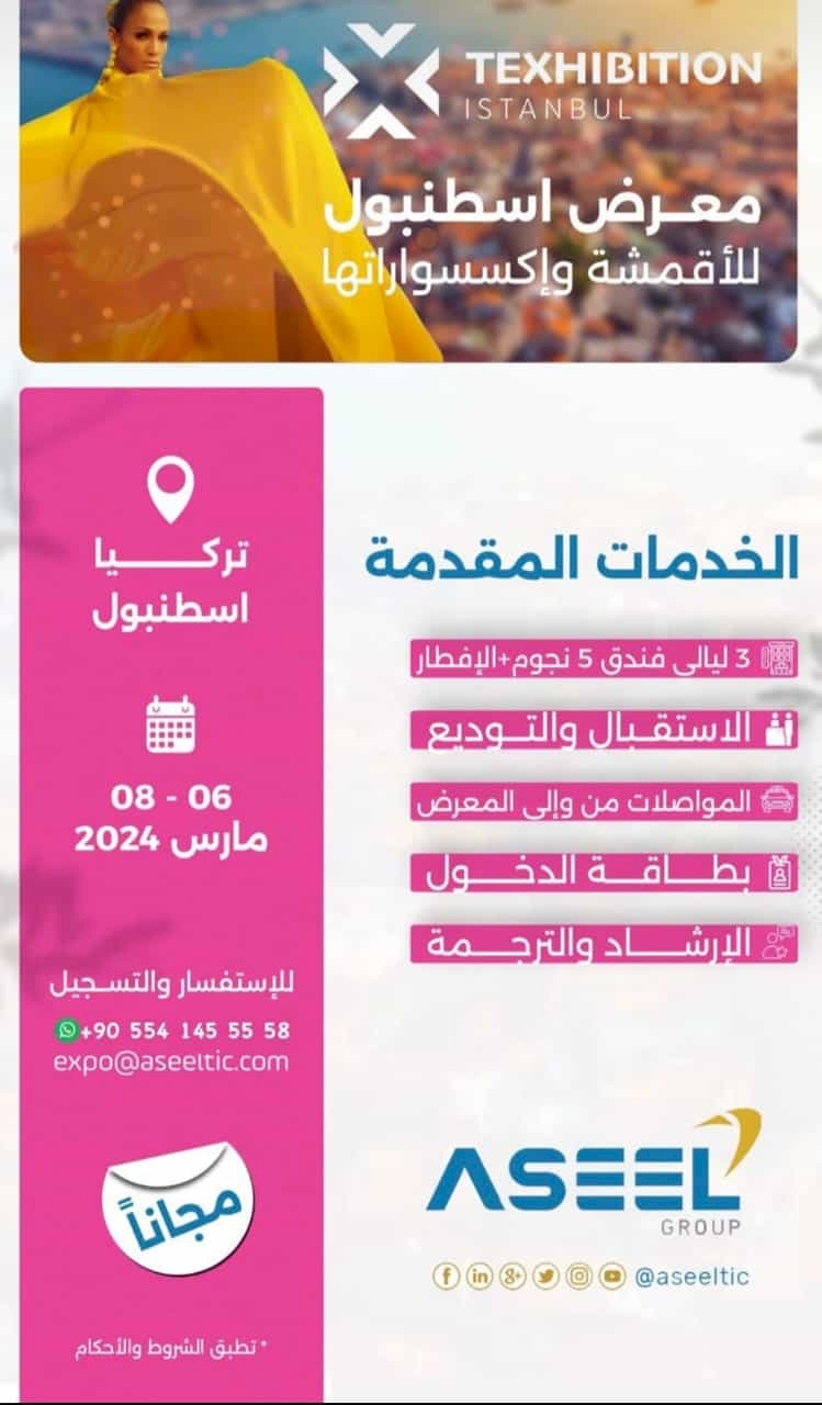 تهديكم غرفة تجارة وصناعة محافظة بيت لحم أطيب التحيات، ونرفق لحضرتكم ما ورد الينا من مجموعة أسيل التجارية بخصوص المشاركة في معرض إسطنبول للأقمشة واكسسواراتها والمنعقد خلال الفترة الواقعة ما بين 06 لغاية 08 اذار لعام 2024.