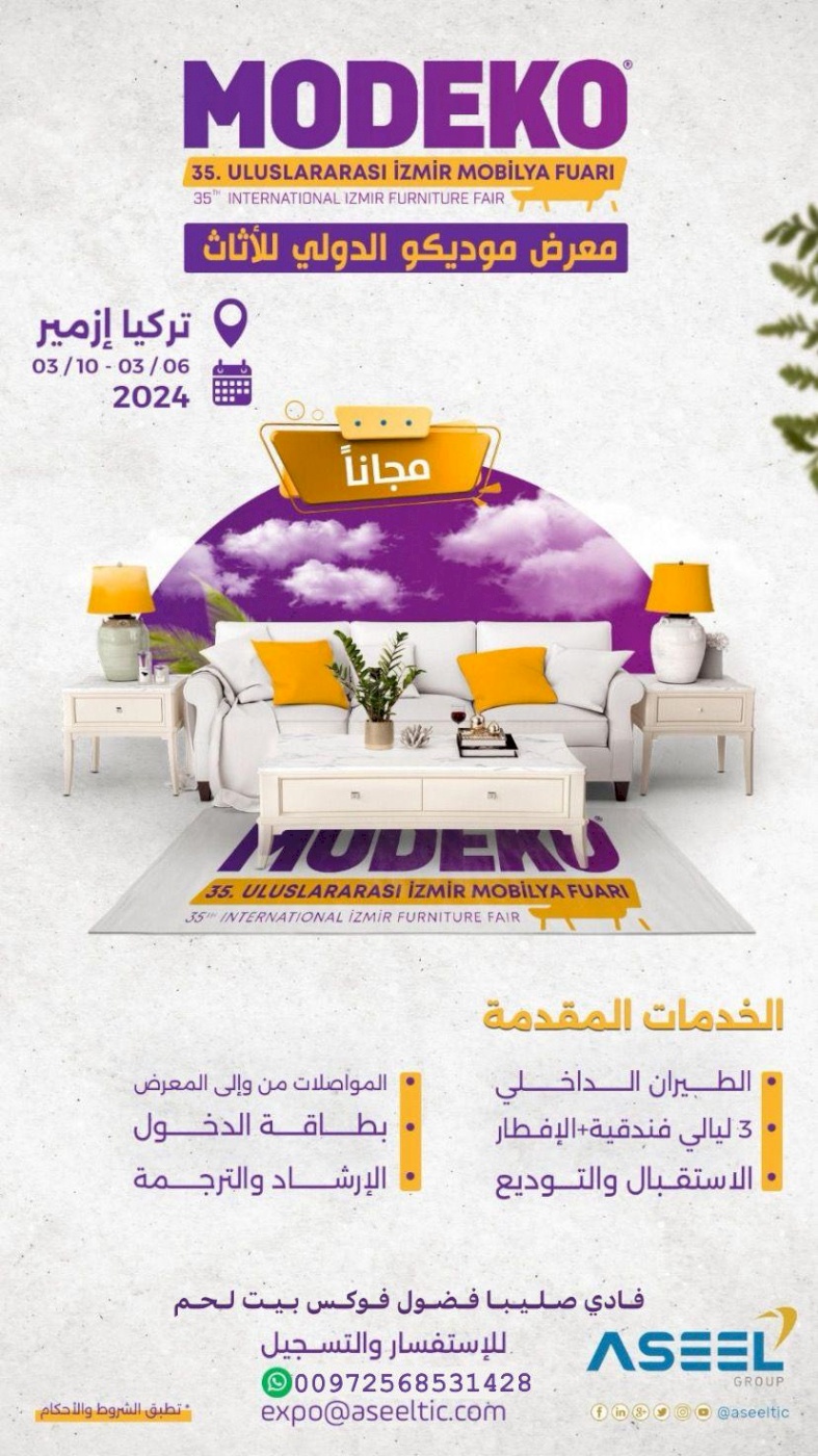 تهديكم غرفة تجارة وصناعة محافظة بيت لحم أطيب التحيات، ونرفق لحضرتكم ما ورد الينا من مجموعة أسيل التجارية بخصوص المشاركة في معرض موديكو الدولي للأثاث في ازمير والمنعقد خلال الفترة الواقعة ما بين 06 لغاية 10 اذار لعام 2024.