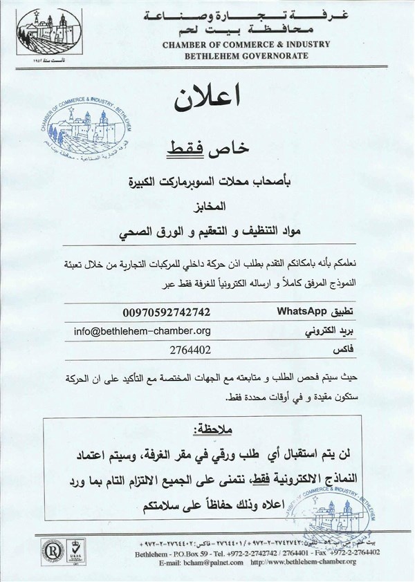 اعلان خاص فقط بأصحاب محلات السوبر ماركت الكبيرة و المخابز ومواد التنظيف والتعقيم والورق الصحي