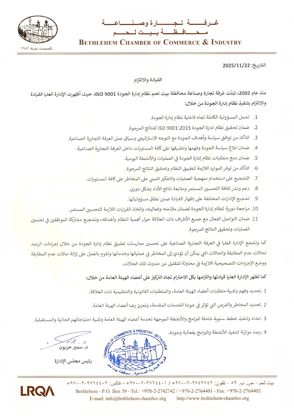 وثيقة القيادة والالتزام المعمول بها في الغرفة التجارية الصناعية وفقاً لمتطلبات المواصفة الدولية ISO 9001:2015