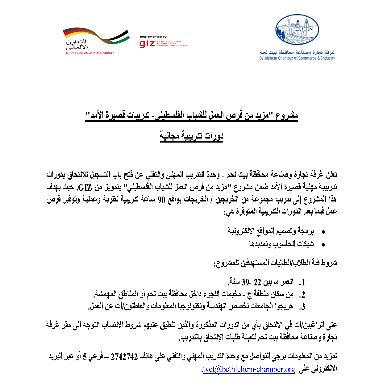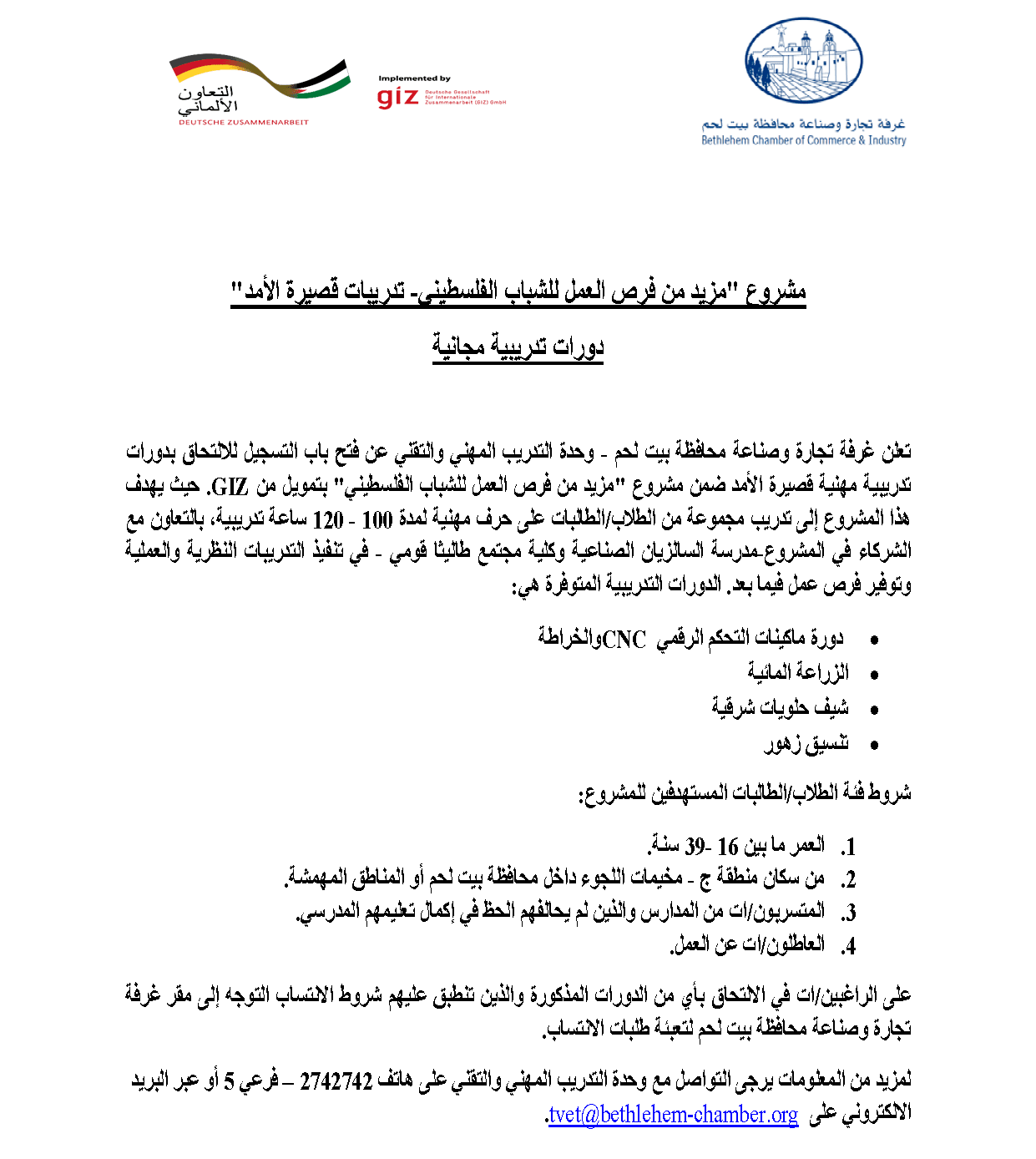 إعلان دورات تدريبية مهنية - مجانية تعلن غرفة تجارة وصناعة محافظة بيت لحم وبدعم من GIZ عن فتح باب التسجيل لدورة تدريبية مهنية ضمن مشروع مزيد من فرص العمل للشباب الفلسطيني ومقدمة مجاناً ضمن الفئات المحددة. مجالات الدورات التدريبية المتوفرة هي: